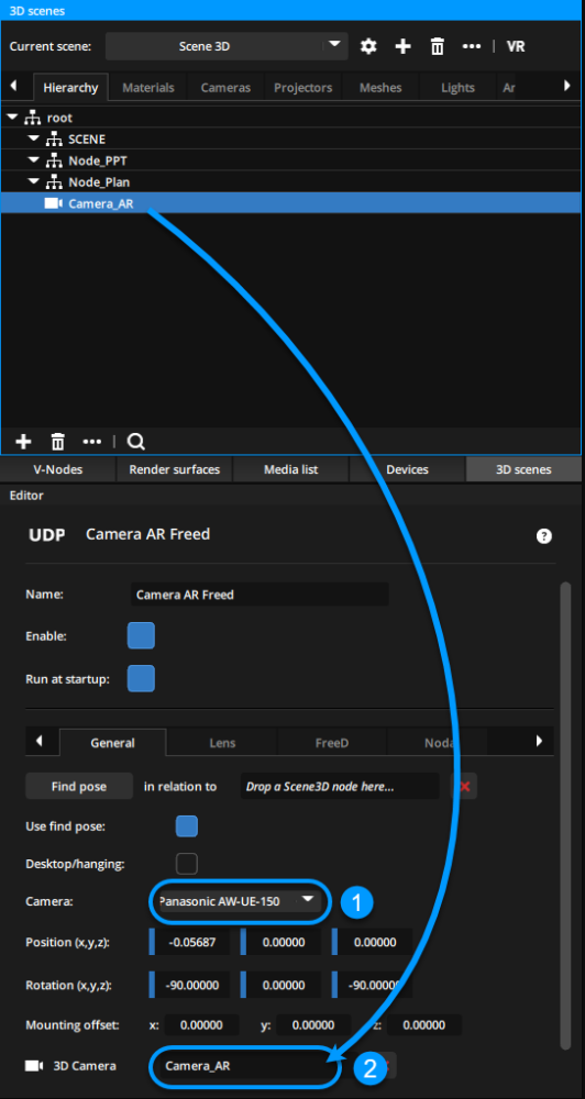 - Then, in the Editor windows, go to General tab, select Panasonic AW-UE-150 from the Camera dropdown menu and drag and drop your 3D camera from the 3D scenelist to the 3D Camera field