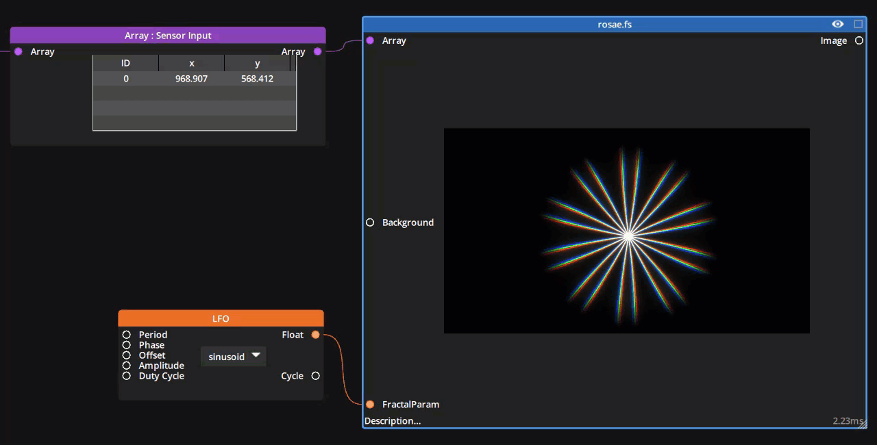 Radius: 500Soft Edge: 0.8Fractal Parameter: Animated with an LFO between 0 and 50Petals: 10Width: 5RGB Splitting: 1RotSpeed: 0AngleOffset: 0