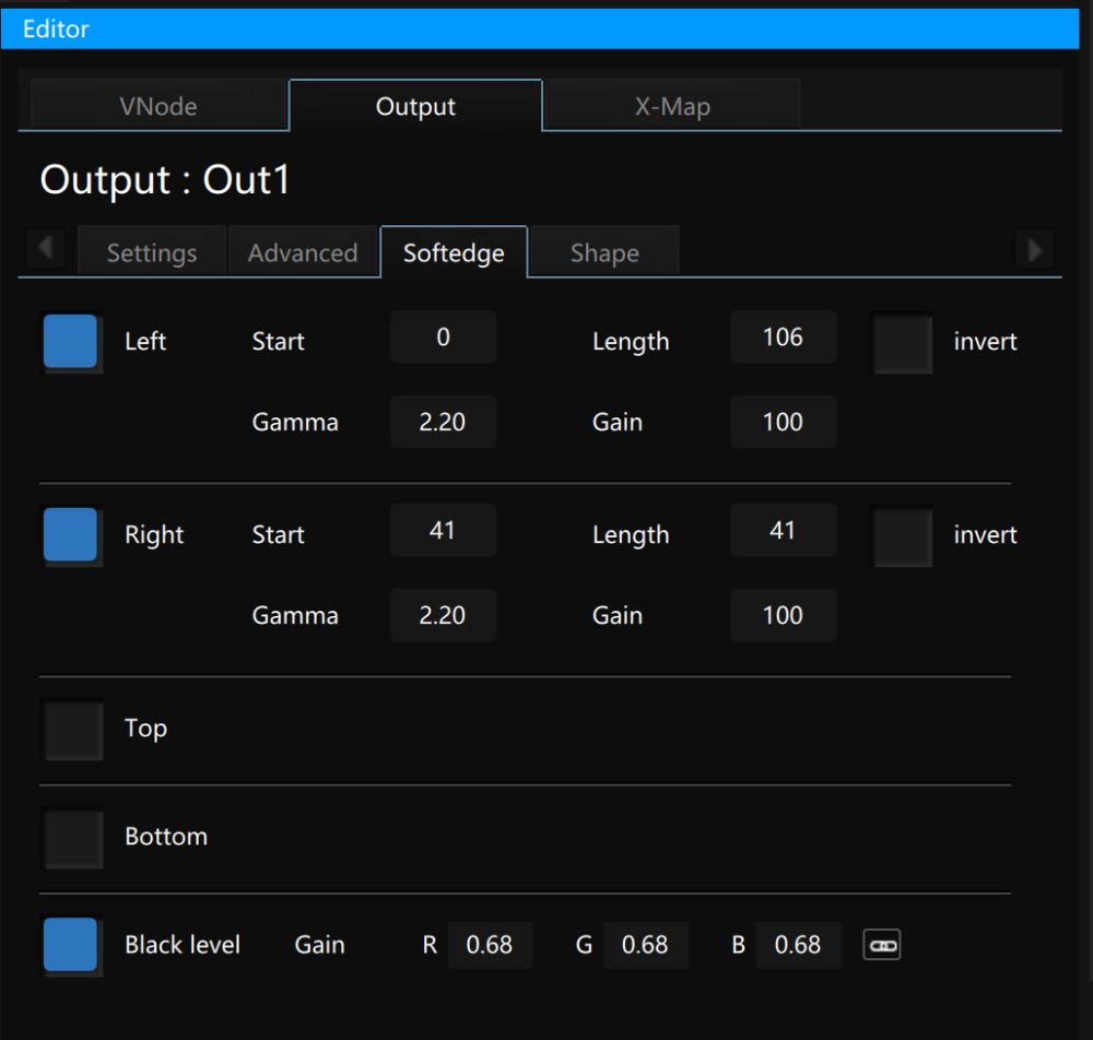 • BlackLevel: You can adjust the grayscale outside of the soft edge. It can help reduce the double video black on the soft edges.