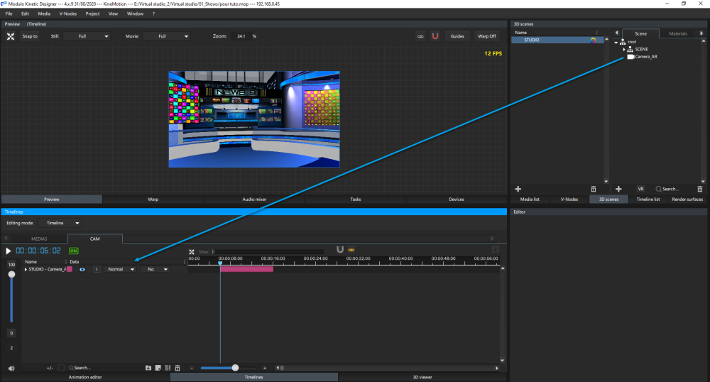 - Drag and drop the 3D camera on a layer in the timeline and place it in the rendersurface of your Vnode.