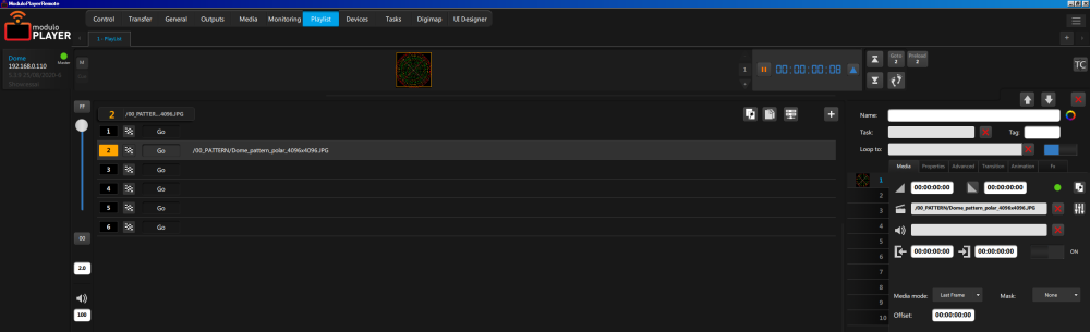 - On the Transfer page, transfer the Dome_pattern_polar_4096×4096.jpg media from your Modulo Player Remote (left part) to the Modulo Player server (right part).